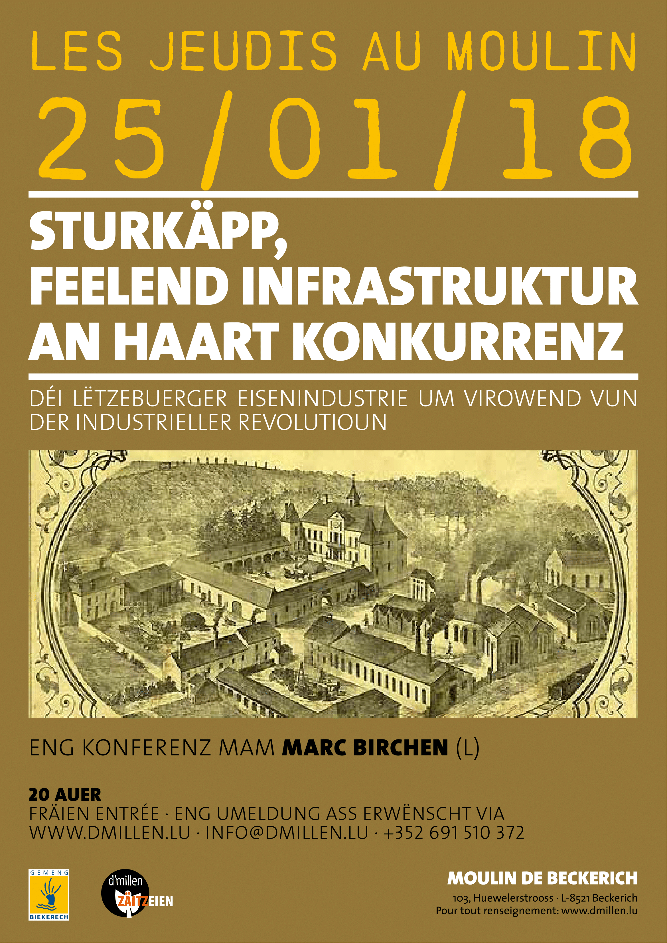Dës Konferenz riicht de Bléck ob d’Schmelze virun der industrieller Revolutioun a weist den Iwwerliewenskampf vu senge Propriétairen am Kontext vu déifgräifende geopolitesche Verännerungen nom Wiener Kongress vun 1815. Dobäi stellt sech d’Fro vun der historescher Bewäertung vun dësen Entrepreneuren: Hu mir et wierklech mat Sturkäpp ze dinn, wéi ee sou oft noliesen kann?