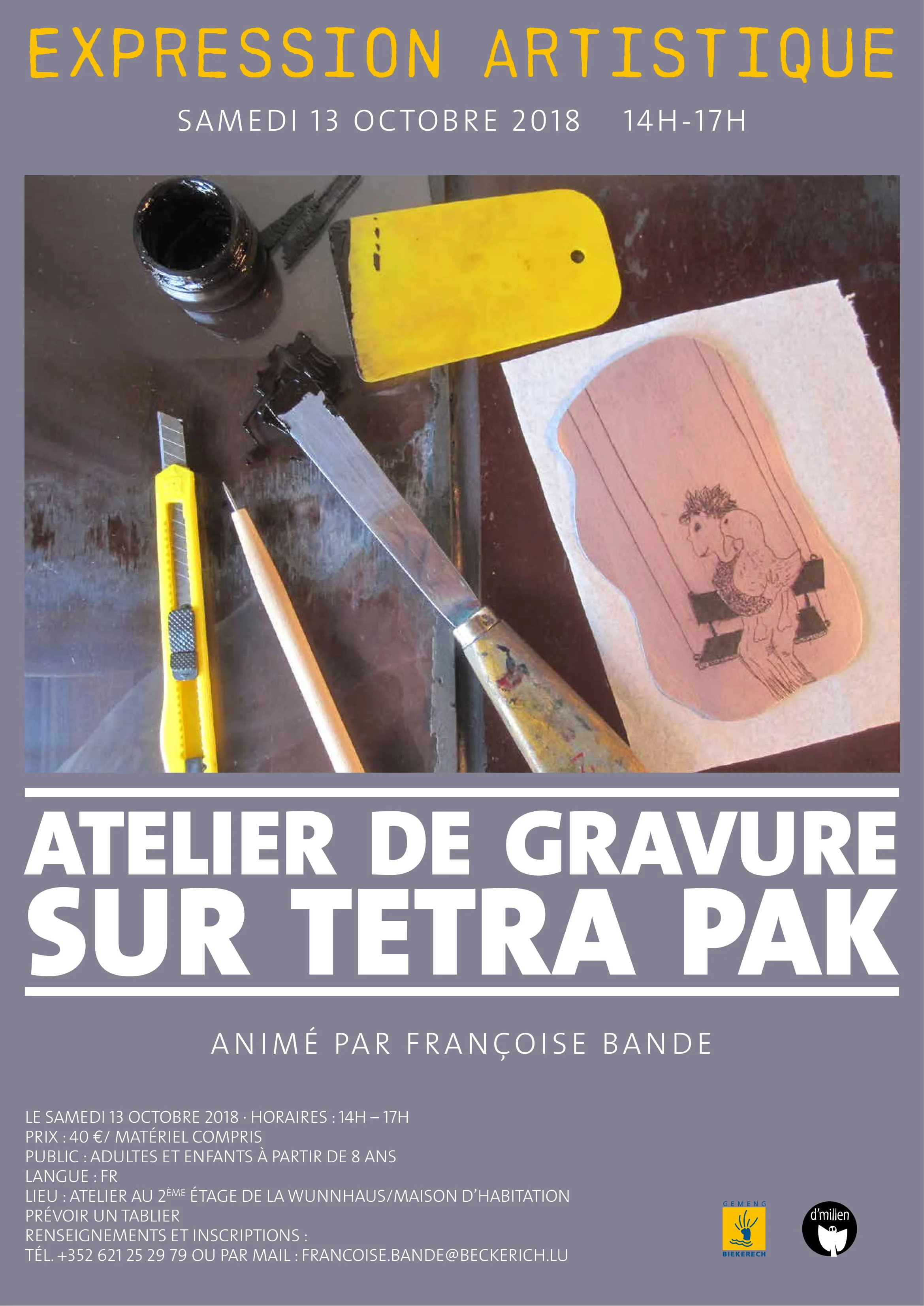 Un atelier ludique et familial proposant la découverte d’une technique qui permet de graver dans un matériau de récupération (boîte de lait ou de jus) avec un crayon pointe. Après l’encrage de la feuille de Tetra Pak, vient le tirage à l’aide d’une presse pour obtenir des images originales et multiples.