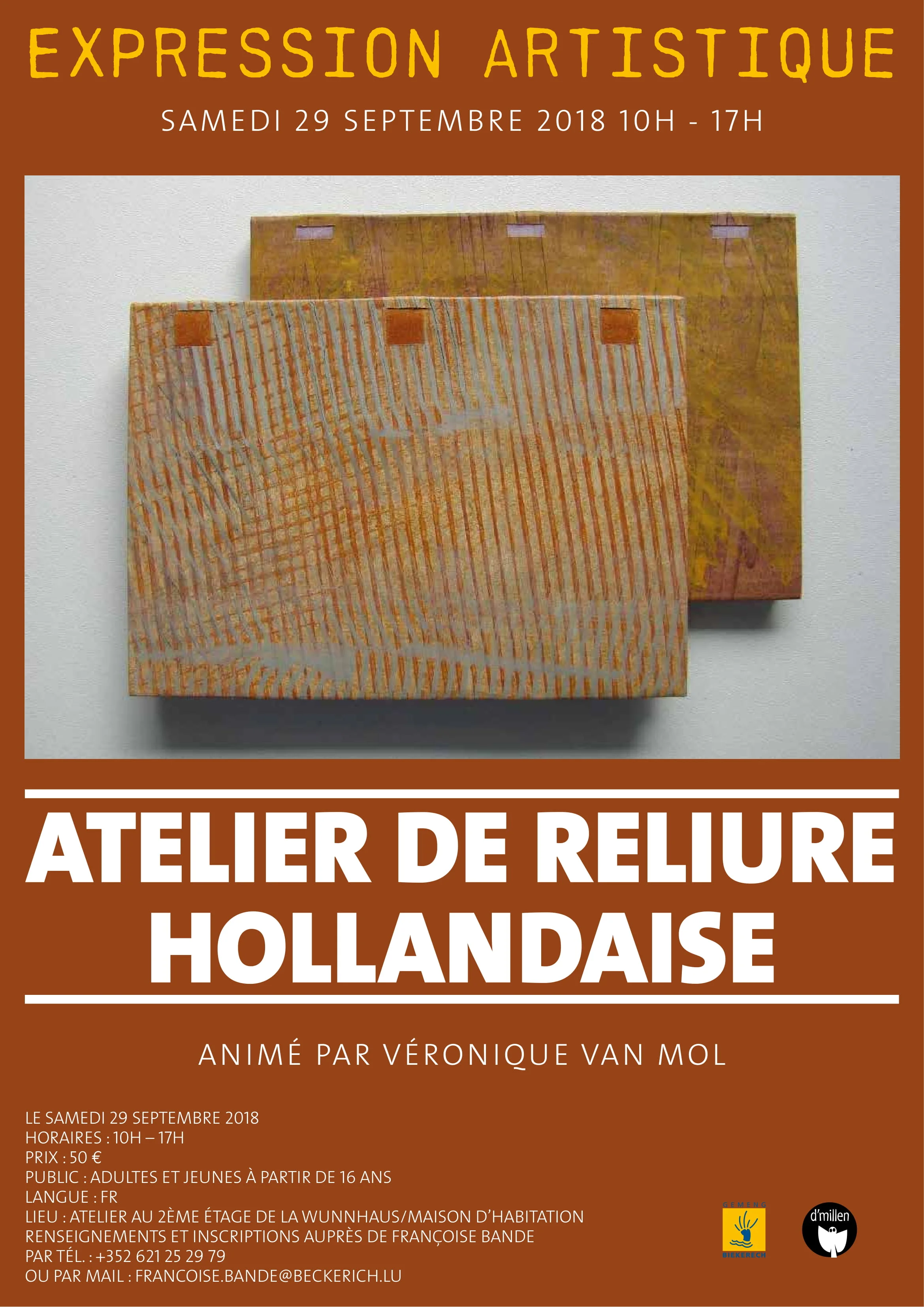 Lors de cette journée, nous réaliserons une reliure en papier décoré-griffé et rubans assortis. L’atelier est animé par Véronique Van Mol, diplômée de l’ENSAV en 1986. Elle est relieure indépendante depuis 1987, à Mons ensuite à Bertrix et expose régulièrement en Belgique et à l’étranger.