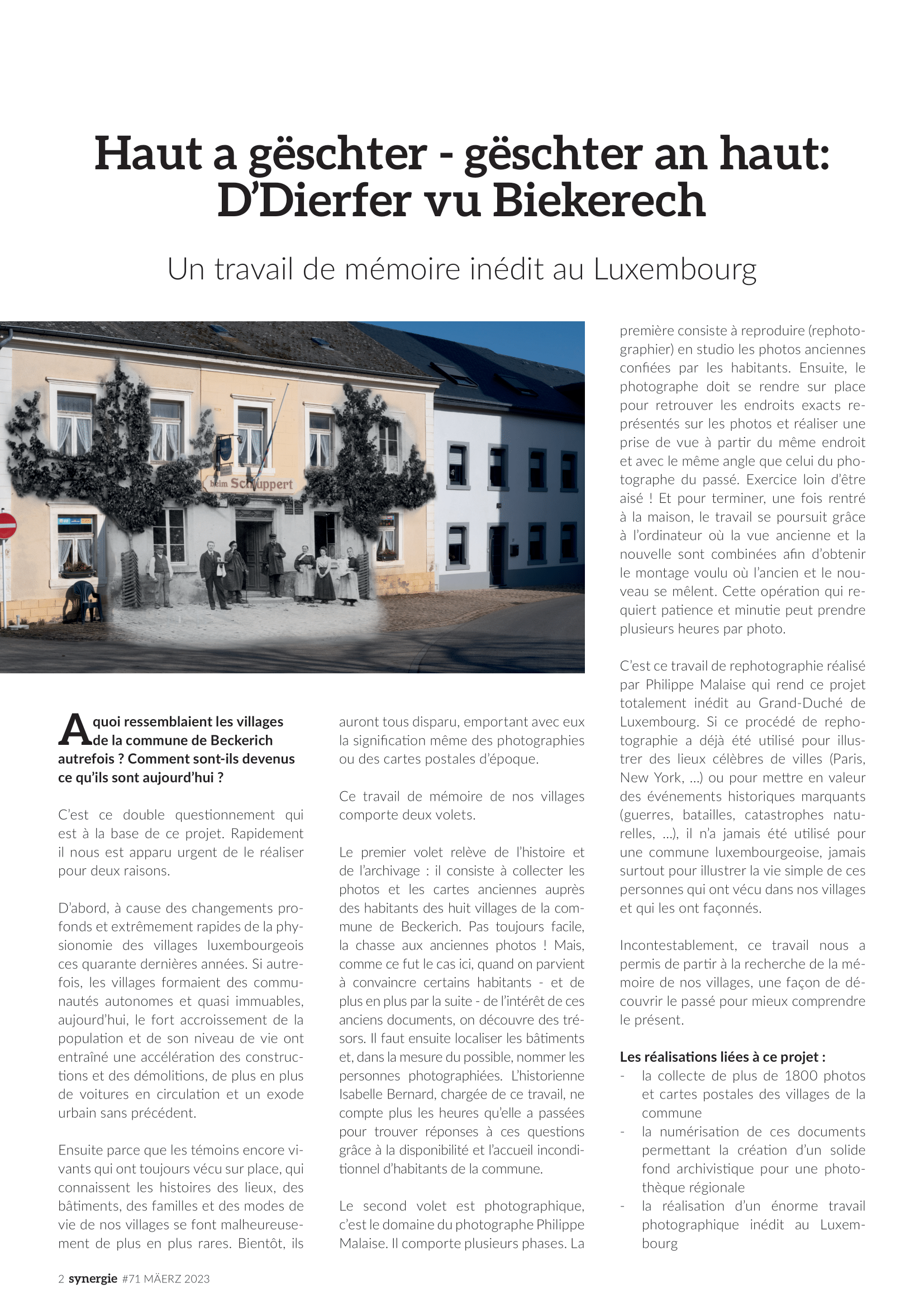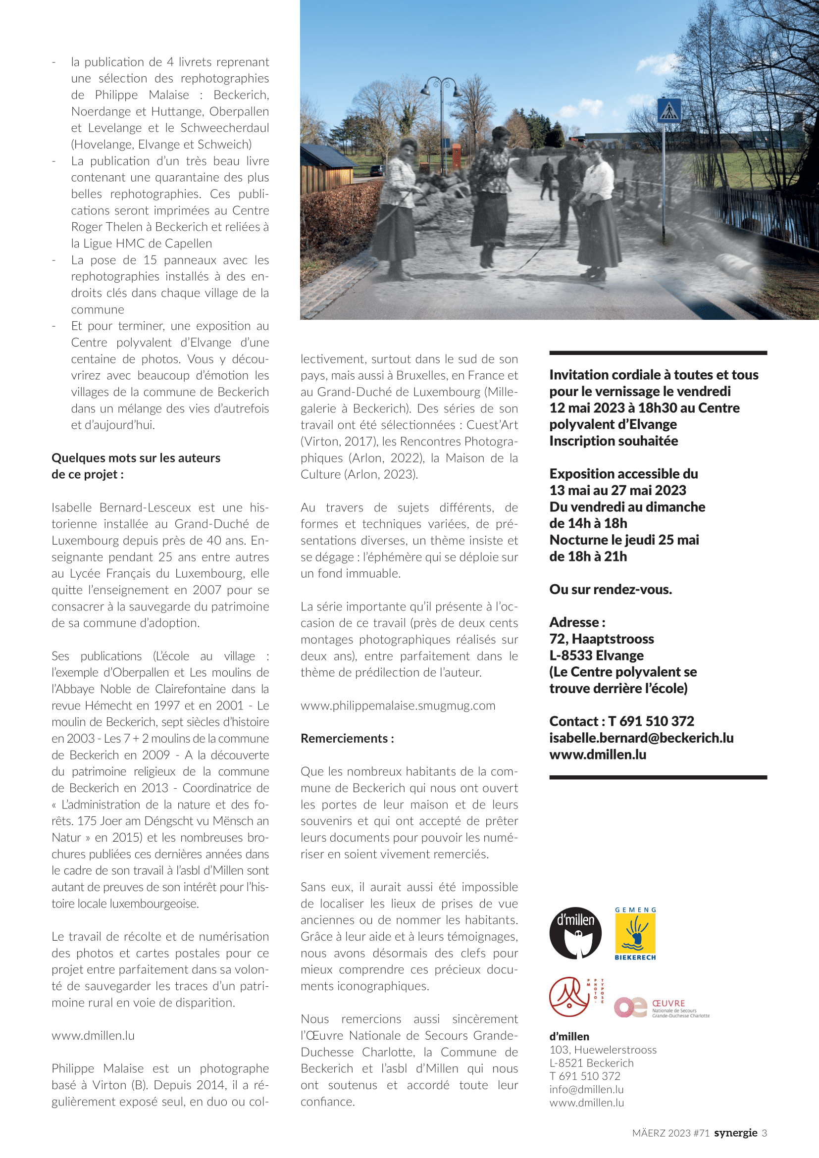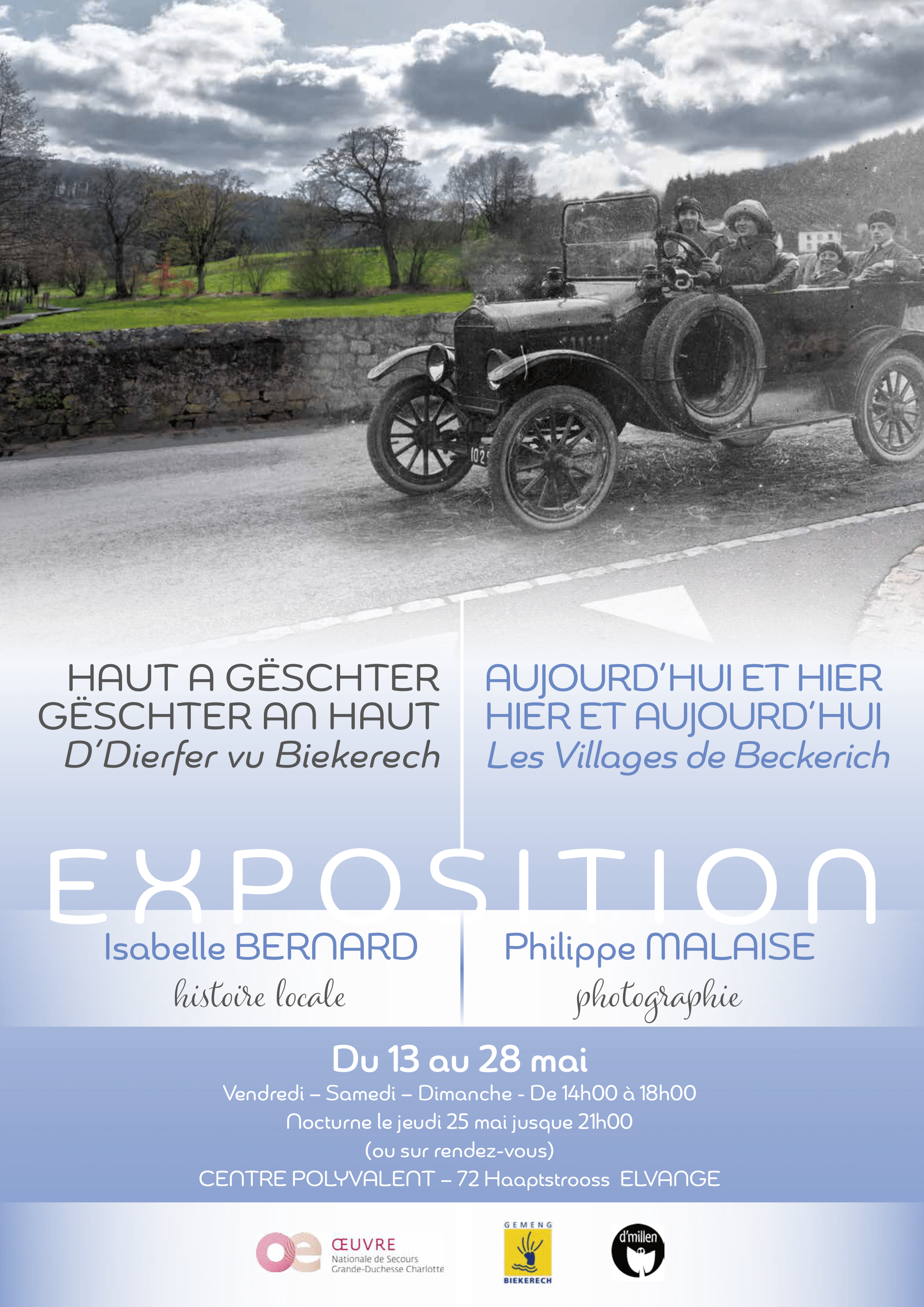 Vous pourrez y découvrir plus de 120 rephotographies (c’est-à-dire des photographies d’un même lieu à des époques différentes) des huit villages de la commune de Beckerich réalisées par le photographe Philippe Malaise.
